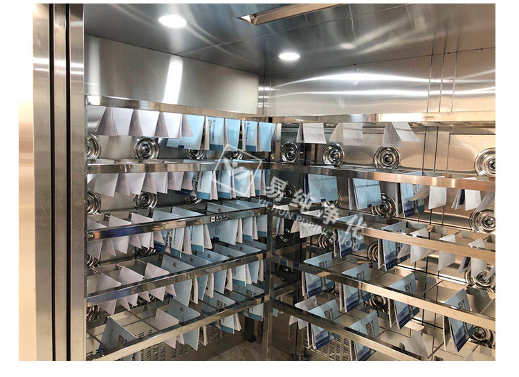 工作原理介紹:檔案消毒除塵室采用全不銹鋼材質(zhì)制作,進(jìn)門為自動(dòng)感應(yīng)雙側(cè)是移門,人員觸碰按鈕后開(kāi)門,將托盤送入到除塵室內(nèi),人員退出后關(guān)閉自動(dòng)門,當(dāng)門關(guān)閉后,除塵室內(nèi)啟動(dòng)風(fēng)淋除塵,此時(shí)自動(dòng)門鎖閉,工作報(bào)警指示燈顯示為紅色狀態(tài),門無(wú)法打開(kāi)。當(dāng)除塵時(shí)間到達(dá)后,報(bào)警指示燈顯示為綠色并發(fā)出報(bào)警聲音,門為可開(kāi)狀態(tài)。人員取出托盤,將之送入到庫(kù)房?jī)?nèi)進(jìn)行保存。